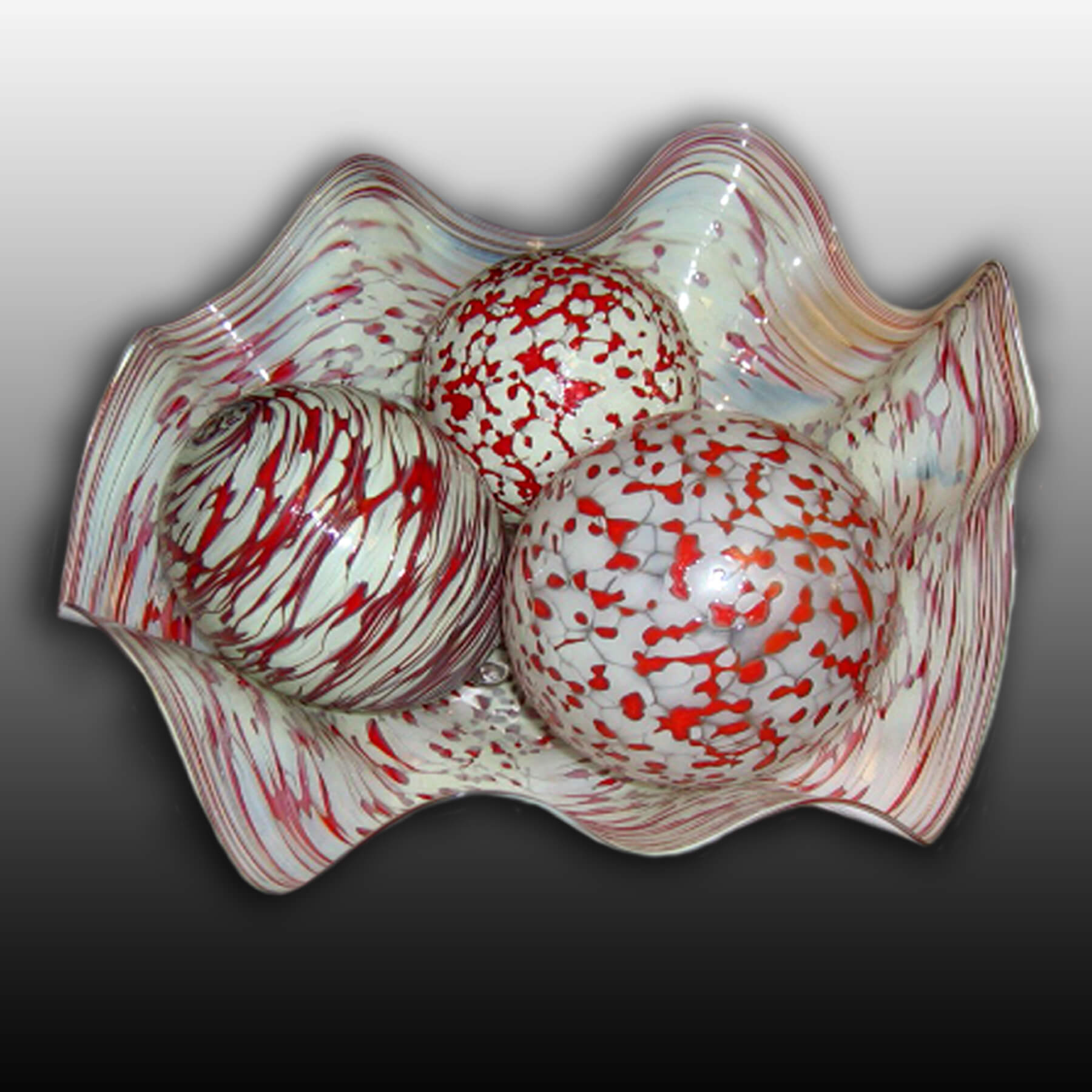 Saffron base with enamel white frit gravity platter. Multi colored Balls of Fire ornaments