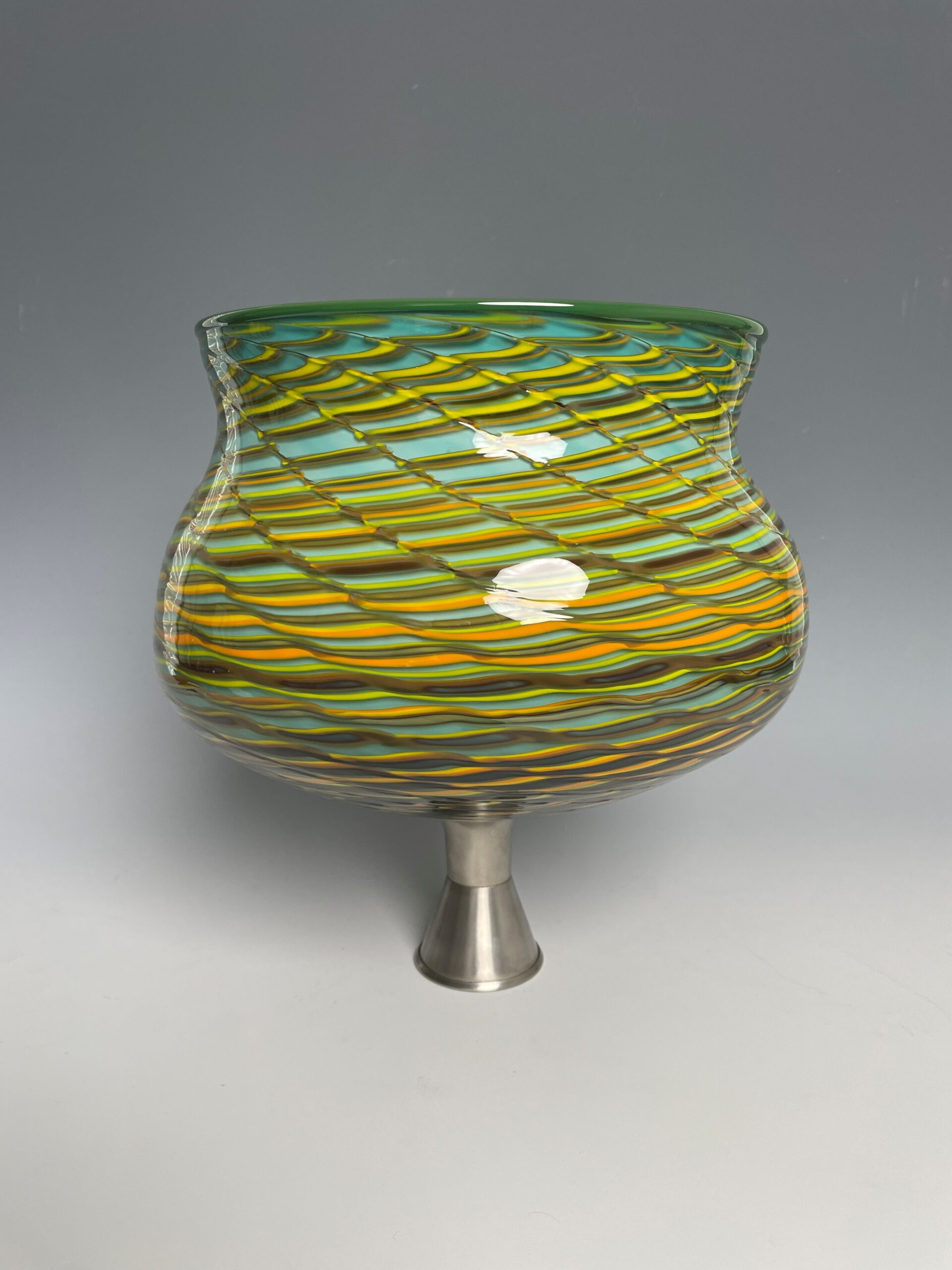 Emanel white base, transparent sky blue overlay, goldbrown, canary, orange optic torque wraps, opal green lip. Stainless steel base included.
